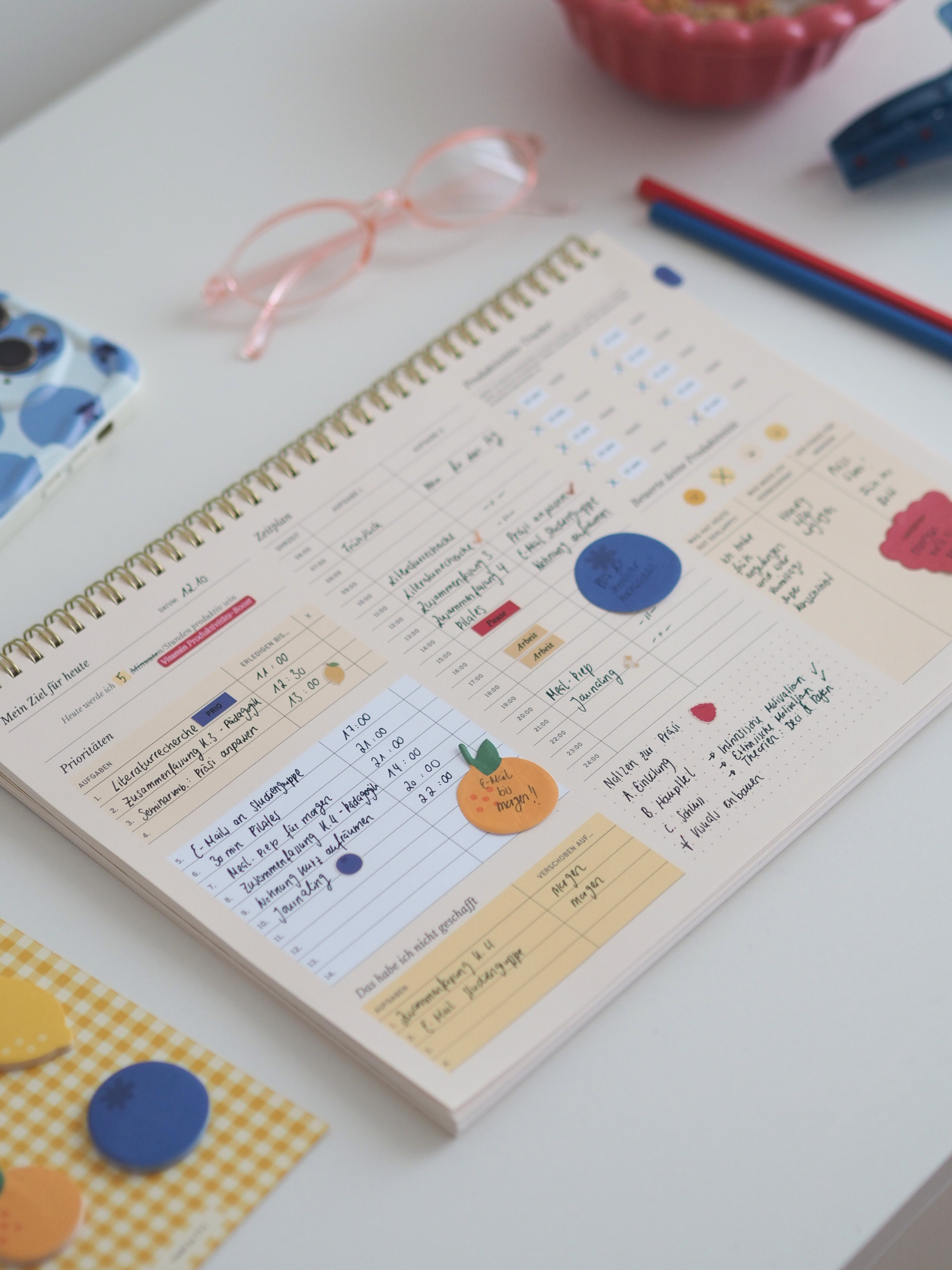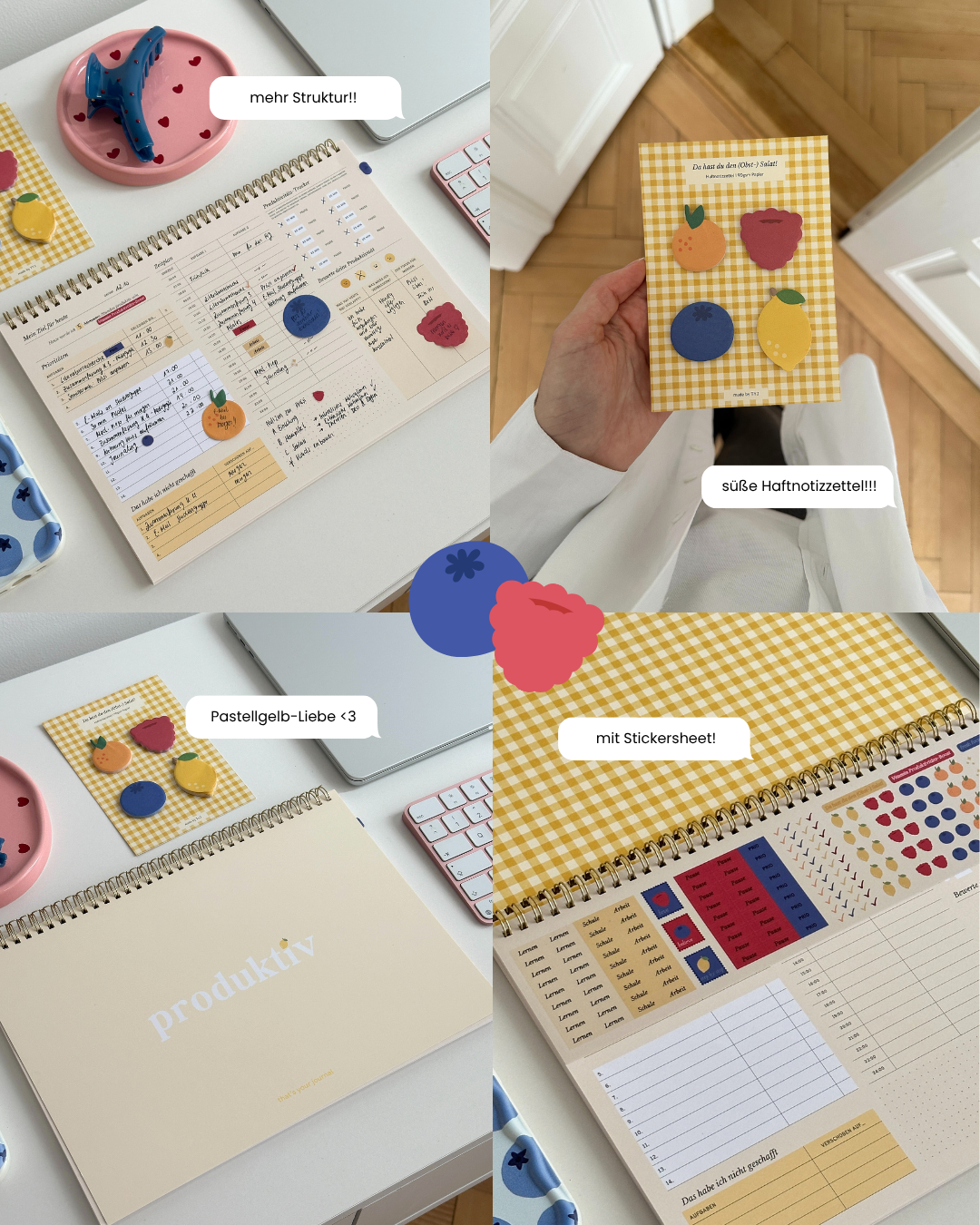 Dieser Planer begleitet dich dabei, den Überblick zu behalten, Prioritäten zu setzen und Schritt für Schritt wirklich das zu schaffen, was dir wichtig ist. Mit den bunten Obst-Haftnotizen und dem liebevoll gestalteten Sticker-Sheet macht das Planen sogar Spaß.